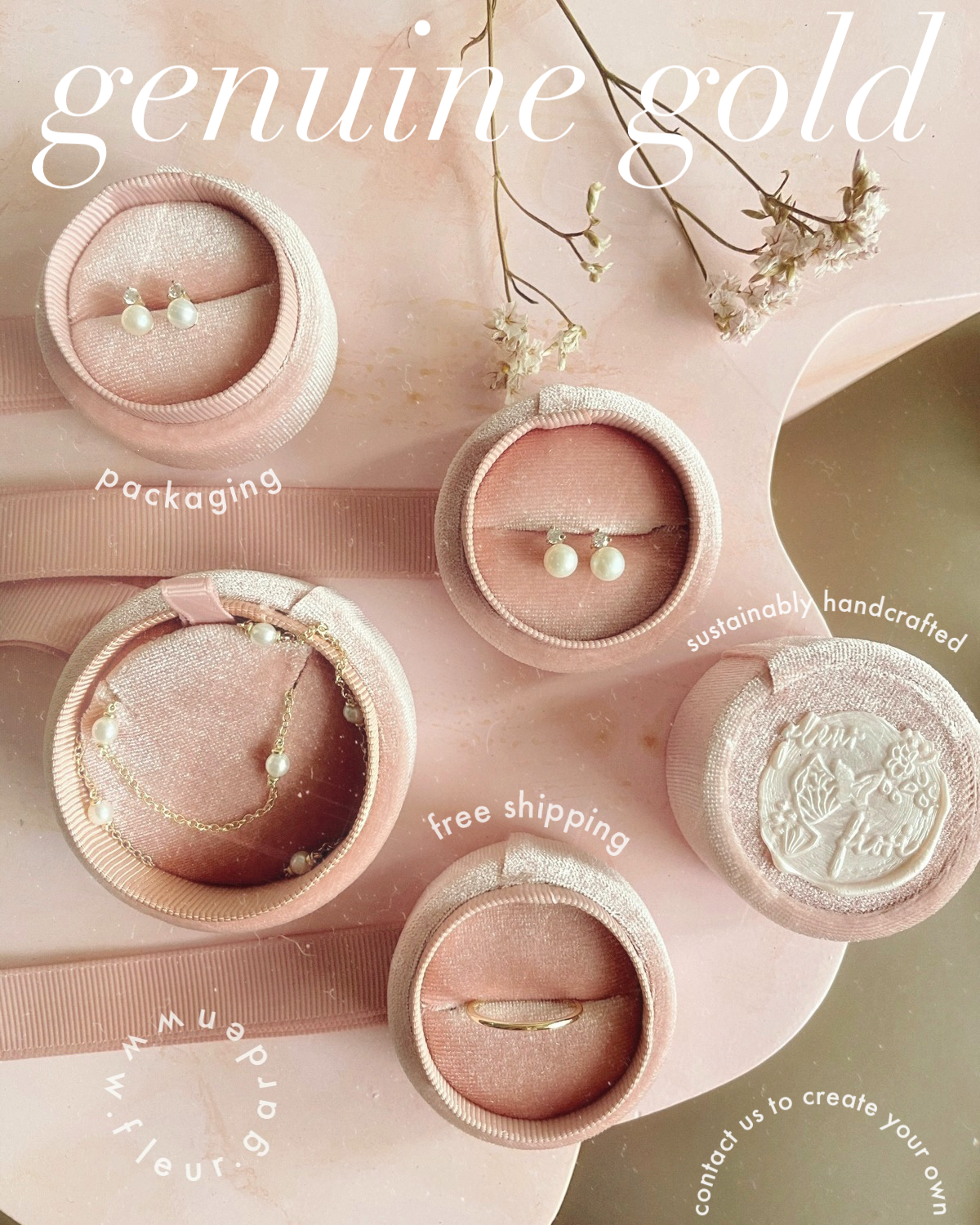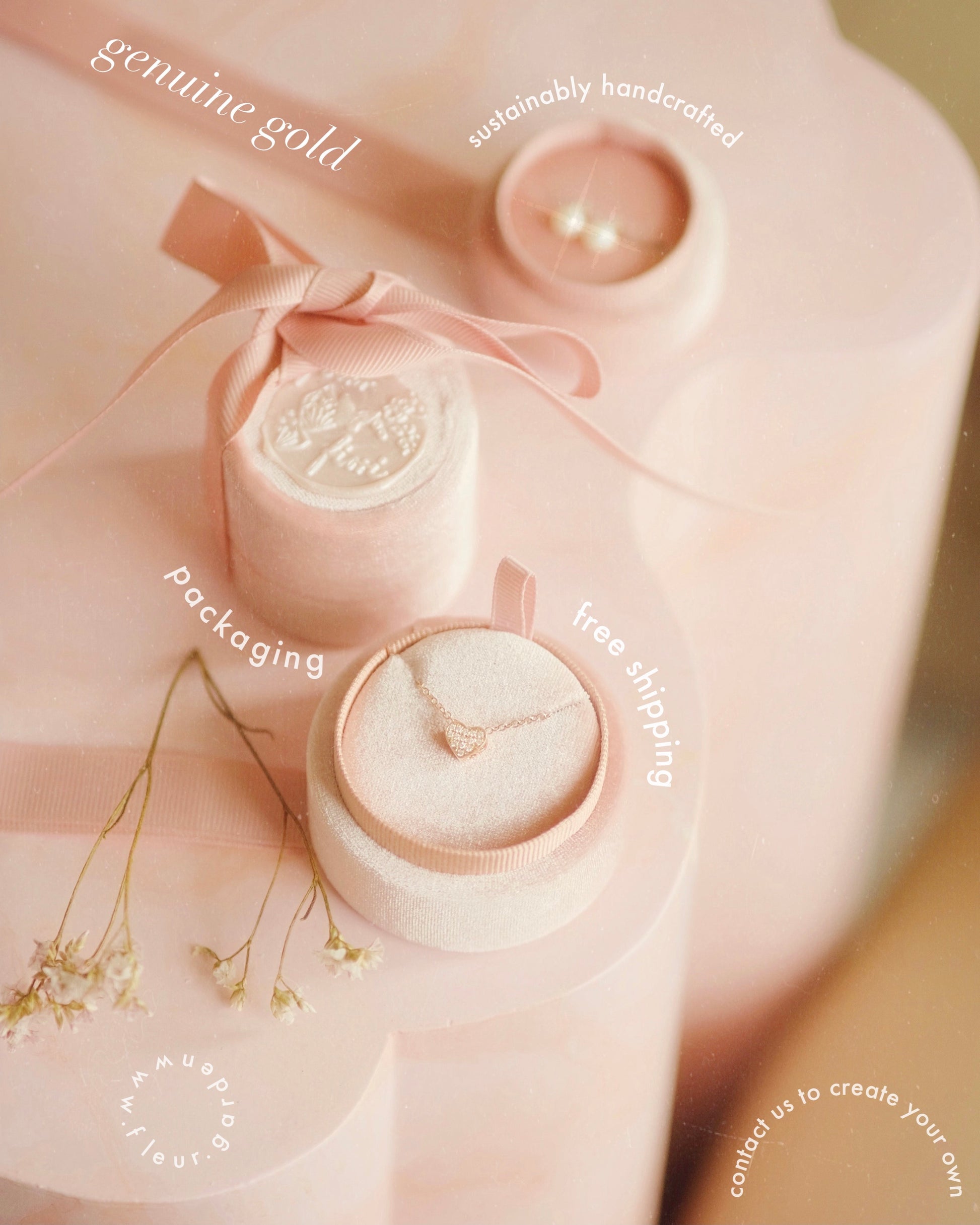 All genuine gold jewelry are wrapped in a romantic pink suede gift box + mini silk tote bag