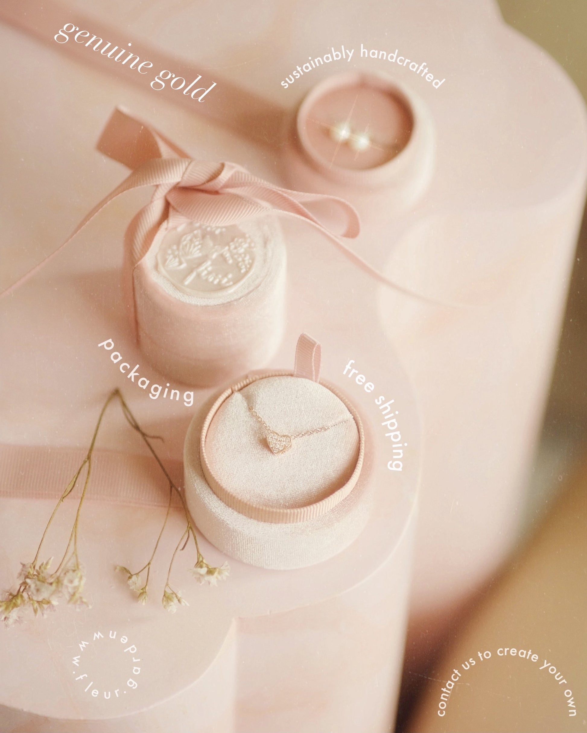 All genuine gold jewelry are wrapped in a romantic pink suede gift box + mini silk tote bag